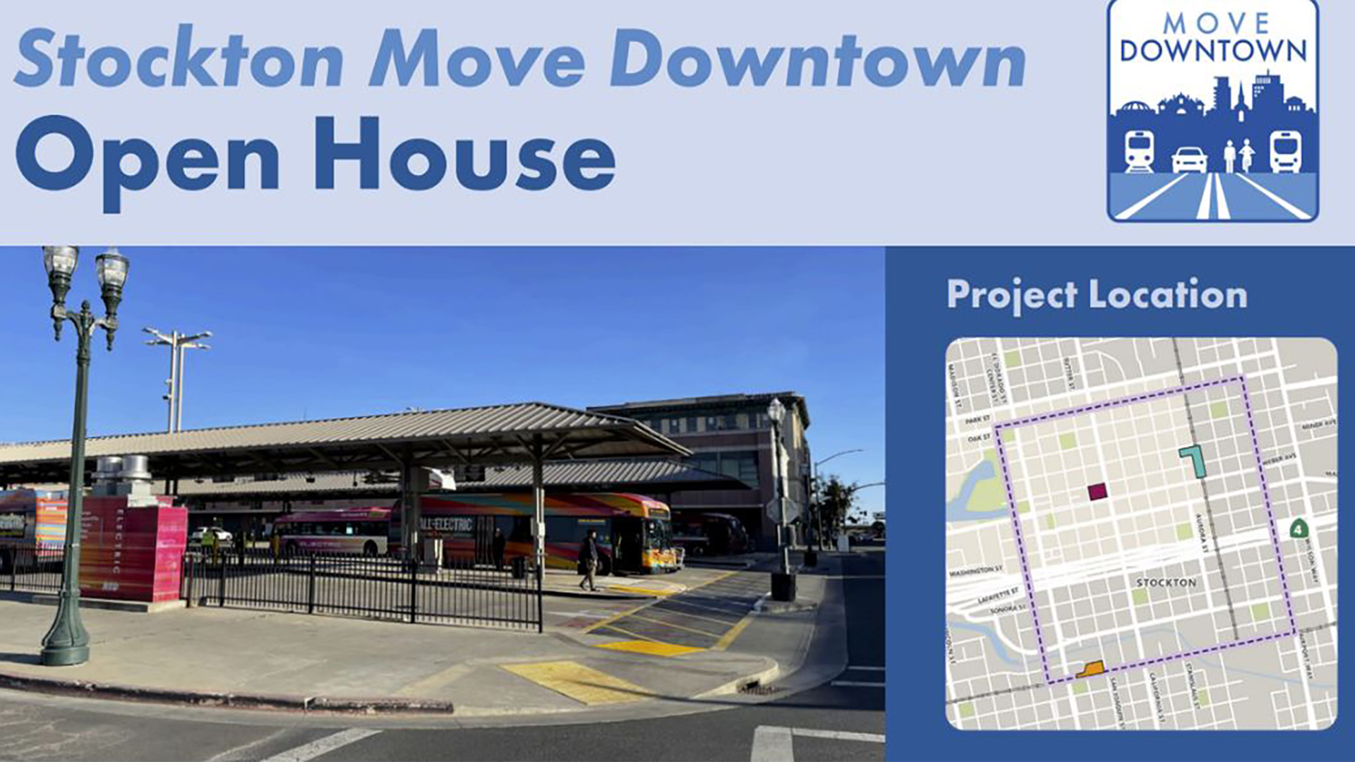 Join us for the Stockton Move Downtown Project Open House. This drop-in event is your chance to learn how the project will explore opportunities to improve safety, mobility, economic vitality, and sustainability in Downtown Stockton.